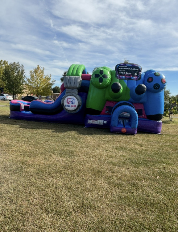 Dive into excitement with the Wet/Dry Dual Lane Gamer Combo! This inflatable marvel is your go-to for all-weather fun, offering both water and dry play options. With dual lanes, you and a friend can race side-by-side, tackling an obstacle course or hurtling down a slide. Perfect for birthdays and get-togethers, this combo brings a gamer twist to traditional bounce house fun, combining interactive play with classic inflatable joy. Whether you're cooling off under the sun or enjoying windswept thrill, this rental promises dynamic adventure for every party.